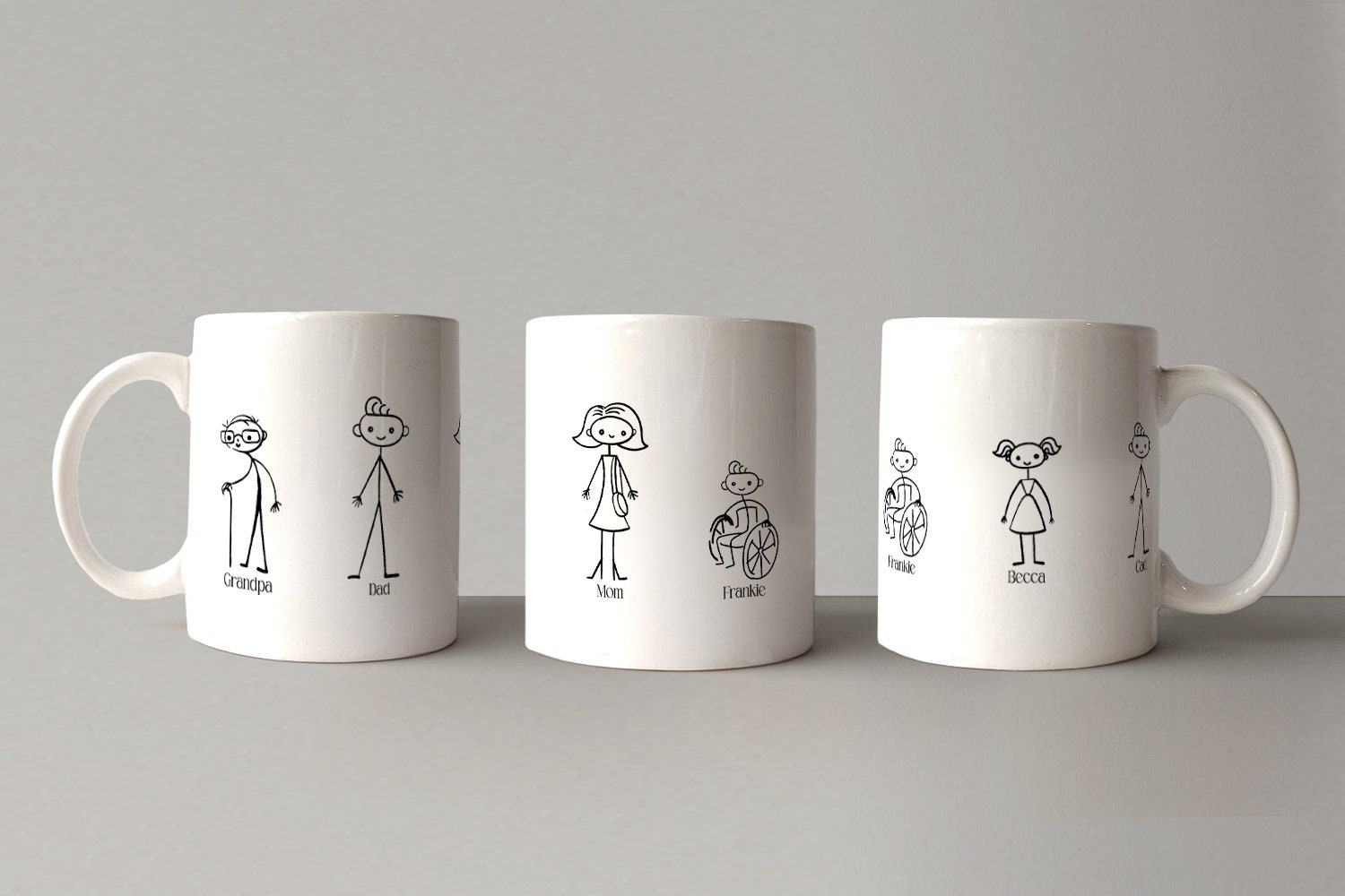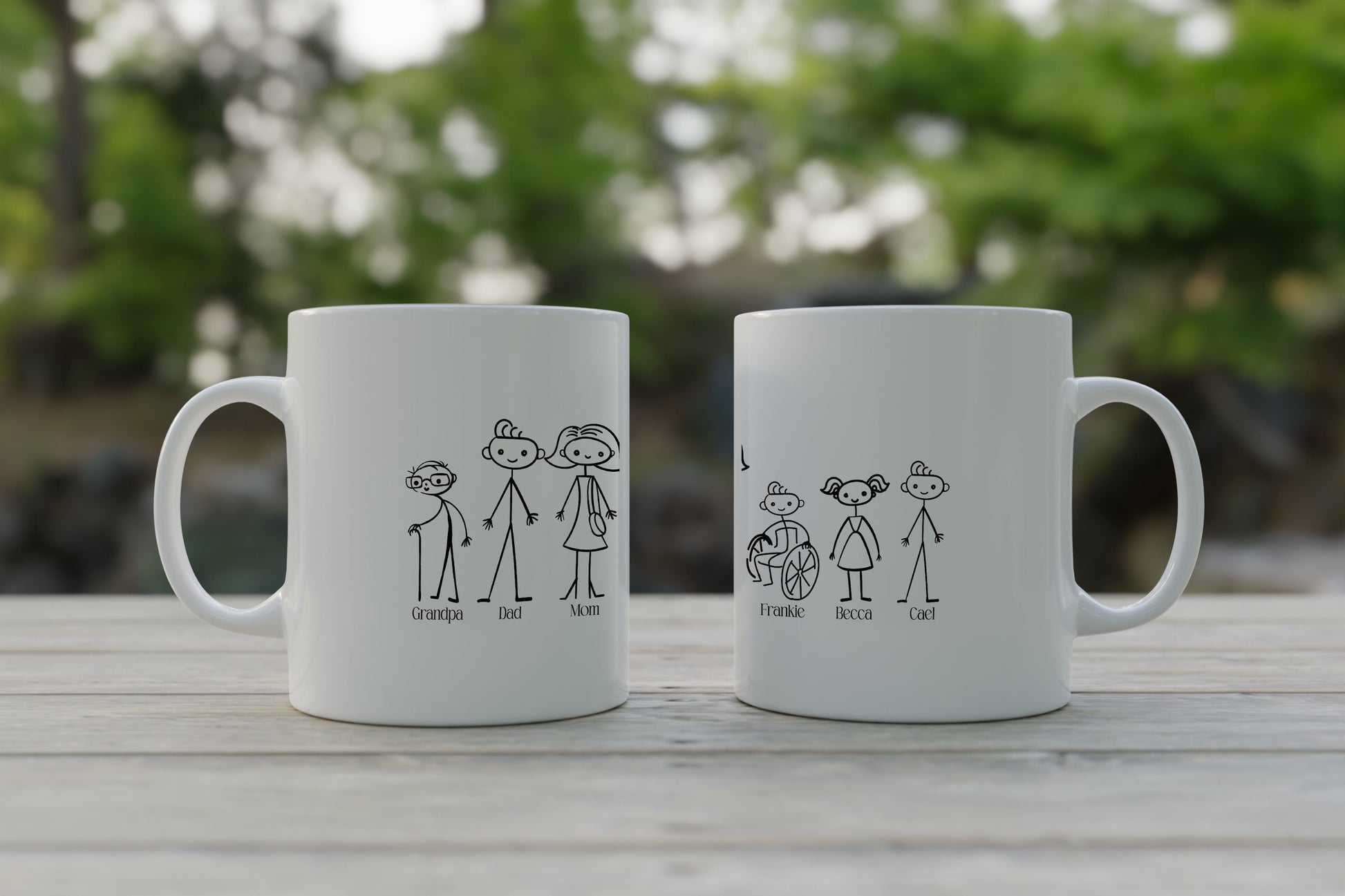 Available in both 11 oz and 15 oz sizes, this charming mug features adorable stick figures representing family members of all ages, from grandparents to infants, even including a wheelchair option to ensure representation for every member of your family.